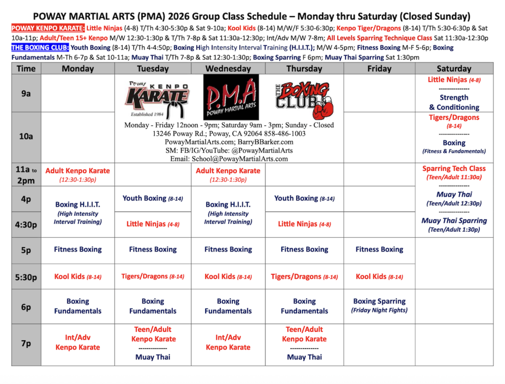 Poway Kenpo was founded in 1984, and still run today by Barry Barker (aka Mr. B) M.A., 9th Degree, L.Ac. Mr. Barker has written 3 books and produced 15 martial art videos in his long martial arts career, and has promoted over 95 Black Belts, including 3 of his children, sons Josh (6th Degree) and Jordan (5th Degree), along with daughter Jessica (3rd Degree). Come try our award-winning program for yourself and Get Started!